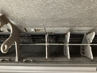 エアコン送風口の汚れです。この部分はエアコン使用時に見えてしまうので、気になってしまう方も多いと思います。夏場冷房を使用するとエアコン内部や送風口は冷たくなっているのに、部屋の気温は暑いのでエアコン内部や送風口は結露するのです。
