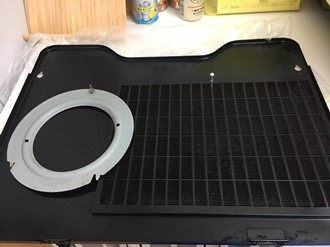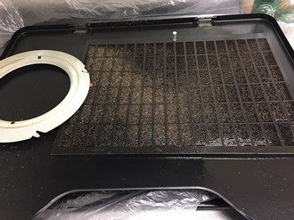 フィルターとカバーです。フィルターは油汚れと・ホコリで目詰まりをしていますし、カバーにも油がついていてベトベトします。フィルターに詰まった油は落とすのが大変ですが、根気よく綺麗にしていきます。。このフィルターが油や汚れで目詰まりしていると、お料理中の臭いや油を上手く吸うことができなくなり、コンロ周りの壁などが汚れやすくなります。