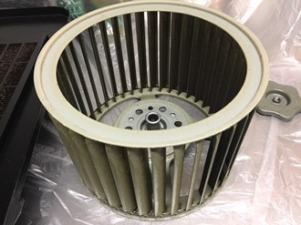 取り外したシロッコファンです。油汚れできいろくなっています。このシロッコファンは洗剤の入ったバケツにつけ置きをして羽根の一枚一枚まで綺麗に洗います。