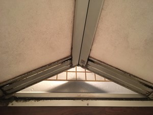 お風呂の扉。写真のようにカビで黒くなり、扉のレールには水垢の塊ができてしまい市販の洗剤では取れなくなってしまったお家をよく見ます。