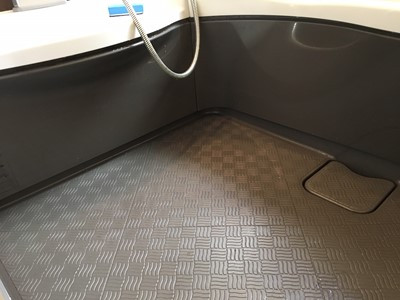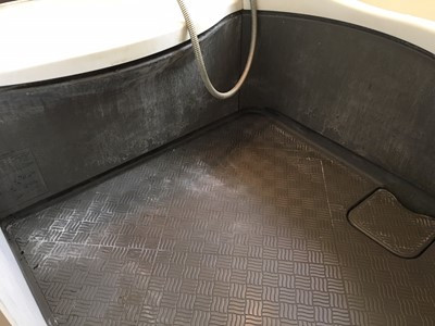 エプロン内部のお掃除は追加料金無しで浴室清掃の範囲になっています。エプロン内部は湿度がとても高くカビがたくさん繫殖するので、全体に除菌漂白をします。漂白剤を均一に噴霧して30分ほど放置しておくと、黒かった部分がだんだんと白くなってくるのでスポンジやブラシで擦り洗いをして、シャワーですすぐとこの通り綺麗になります。