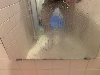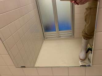 この鏡の鱗汚れは水垢ですので、酸性洗剤を使用して除去するか・ダイヤモンドパッドという研磨剤を使用して物理的に除去する方法があります。今回はそれほど重度ではなかったので、酸性洗剤を塗布して鱗汚れを分解しました。すると、このように綺麗になりました。