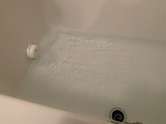 じっくり、風呂釜内を洗浄した後、最初に出てきたようなカスが出てきたり嫌な臭いがしないかを確認します。。洗浄後は写真のように透明な綺麗なお湯が出てきて、嫌な臭