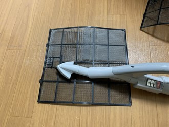 エアコンフィルターのお掃除面倒くさいなーと思われるかもしれませんが、このようにホコリ汚れだけなら掃除機で簡単にすえますよ!こういうちょっとしたことでもエアコンの風量が上がったり、節電効果も得られます?