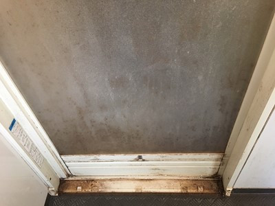 こちらは浴室とびらの内側です。扉部分が白くなっているのはやはり石鹼カスや水垢です。扉の下が黒いのはカビ汚れですね。まず最初にカビ汚れを綺麗にするのに、塩素系の洗剤で除菌・漂白します。