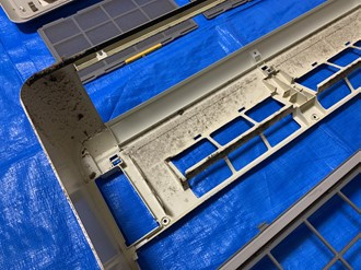 外した本体カバーの裏側もカビで黒く汚れていますね。表面からは見えないのでわかりませんが、エアコンの部品は外してみると裏側は真っ黒に汚れているものなんです。