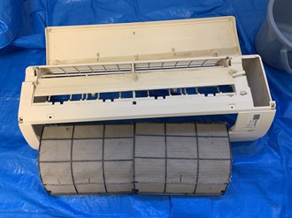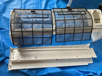 エアコン送風口もご覧の通り、カビ・ホコリで結構汚れていますね。エアコンを洗浄できるように養生して、先ずは洗剤を入れた洗浄液を高圧洗浄機でせいそうしていきます!!