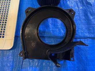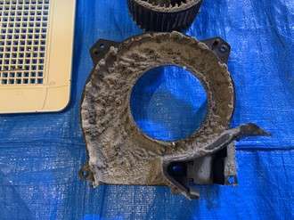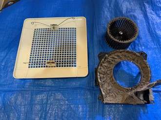 カバーを外すとこのようになっています。お客様がご自身でカバーを外されて掃除機で吸われたため見た目は汚れていないように見えますが、奥に見えるファンはかなりのホコリが詰まっています。