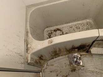お風呂の清掃前の画像です。お風呂の中が全体的にカビで黒くなっていました。ハウスクリーニング業者の私達は見慣れている光景ですが、このブログを見た方はビックリされるかもしれません。確かにこの状態から綺麗にするのは、どうすればいいか分からないかもしれませんね。