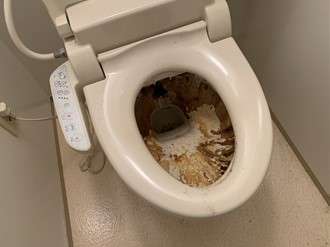トイレの清掃前の画像です。少し衝撃的ですが(笑)便器の中以外はとても綺麗にお掃除をされている様子です。しかし、便器内だけはこのようになってしまっています。多分、ご自身でお掃除されたのですが便器内の汚れは落ちなかったのだと思います。一般的に売られているトイレ用の洗剤は毎日のお掃除には使えますが、尿のカタマリには全くききません。