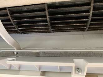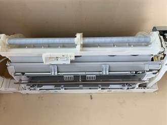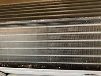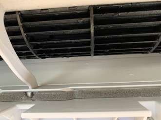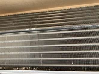 熱交換器がホコリやカビで汚れているとエアコンの効率が悪くなります。こちらのエアコンは見た感じは熱交換器部分は汚れていないように見えますね。ひどく汚れている時はホコリで熱交換器が見えないぐらいのときもあります(笑)