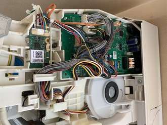 お掃除ロボットを外さないと、熱交換器部分の洗浄ができません。そのお掃除ロボットを外すのに写真に写っている基盤部分の配線を何本か抜かないといけません。
