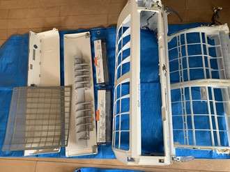 エアコンクリーニングができるように外した部品です。お掃除機能のついていないエアコンに比べると多いですね。他のメーカーではもっともっと部品を外さないといけないこともあります。