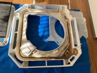 この部品はドレンパンというものです。ドレンパンはエアコン内部で結露した水を受けとめるいわばお皿の役目をしています。しかし、水を受け止める・濡れている状態にあるのでやがてそれはカビに変わります。そこに熱交換器に付着したホコリや汚れも流れてくるのでドレンパンは非常に汚れる場所です。