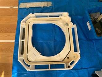 フィルター・ドレンパン・ファンは取り外したので、外で丸洗いして綺麗にしますが、エアコン内部の部分(アルミフィン)は取り外すことができないので、写真のようにエアコンクリーニング専用の養生をして、外部に水や洗剤が飛び散らないようにしてこの中でアルミフィンを高圧洗浄機で綺麗にしていきます。
