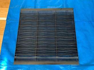 洗浄前のアルミフィンです。見た感じはそんなに汚れていないように見えます。汚れが酷いときはこのアルミフィンにホコリやカビのカタマリがびっしりとついていてアルミフィンが見えていない時もあります(笑)