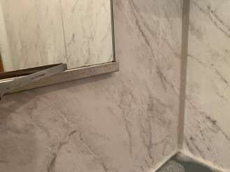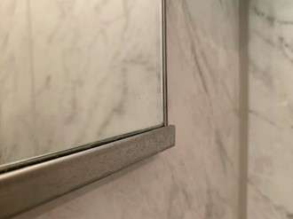 水あかや石鹼カスがつくと、だんだんと鏡がこのように白くなってきます。多少白くなっているようなら、これはナイロンたわしやメラミンスポンジに中性洗剤かお風呂用の洗剤をつけて擦れば綺麗になります。(鏡に曇り止めのコーティングが施工してある場合はコーティングが剝がれますので、事前に確認してからにしてください)