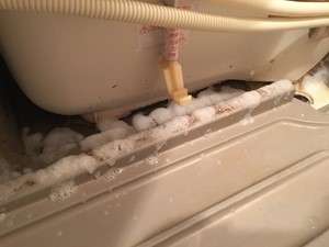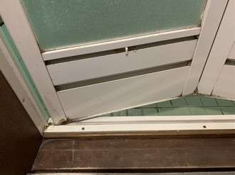 次に扉下部の通気口の掃除です。ここは本当に見落としてしまう部分です。しゃがみ込んで覗いてみると分かりますが、ここはカビと水垢とホコリが混じって厄介なことになっています。隙間が狭くてブラシが入りにくいので、お風呂用の洗剤などをスプレーして少し汚れを柔らかくしたらシャワーの水圧で一気に流します。それでも汚れが残ったら、割り箸を突っ込んで汚れを取り除くという方法もあります。