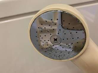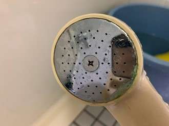 ついつい見落としがちですが、シャワーヘッドを見るとこのようにカタマリになった水垢がついていていることがあります。シャワーヘッドの縁に緑の汚れがついているのがわかりますね。