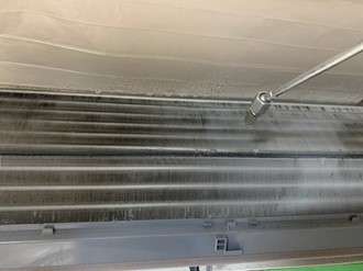 それを、洗剤と高圧洗浄機を使用することでこのように除去することができます。このように汚れているということはエアコンを使用した時に、この汚れも一緒に出てきているということです。このようなエアコンの汚れが人間の身体や大事なペットに悪さをするのです。エアコンが綺麗になると風も綺麗になりますし、咳やクシャミの悩みも改善されます。