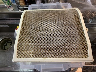 すると、油がついてきて徐々に白いフィルターが黄色くなってきます。そうしたら、またすぐに新しいのに張り替えてください。そうすることで、吸い込んだ油はこの不織布のフィルターで止まってくれるので、アルミのフィルターも汚れにくくなるので、お掃除が楽になりますね(^^)
